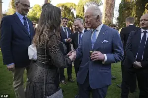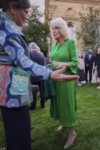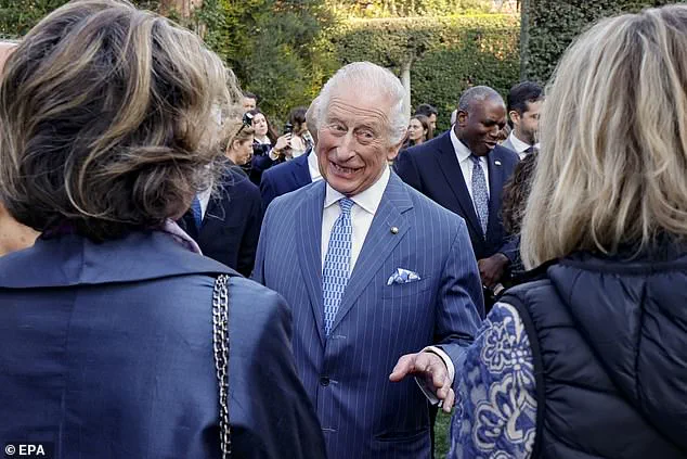 She and Charles, 76, grinned as they mingled with members of the British community in the Mediterranean nation, hosted at the stunning Villa Wolkonsky, where the royal couple are staying, in Rome.