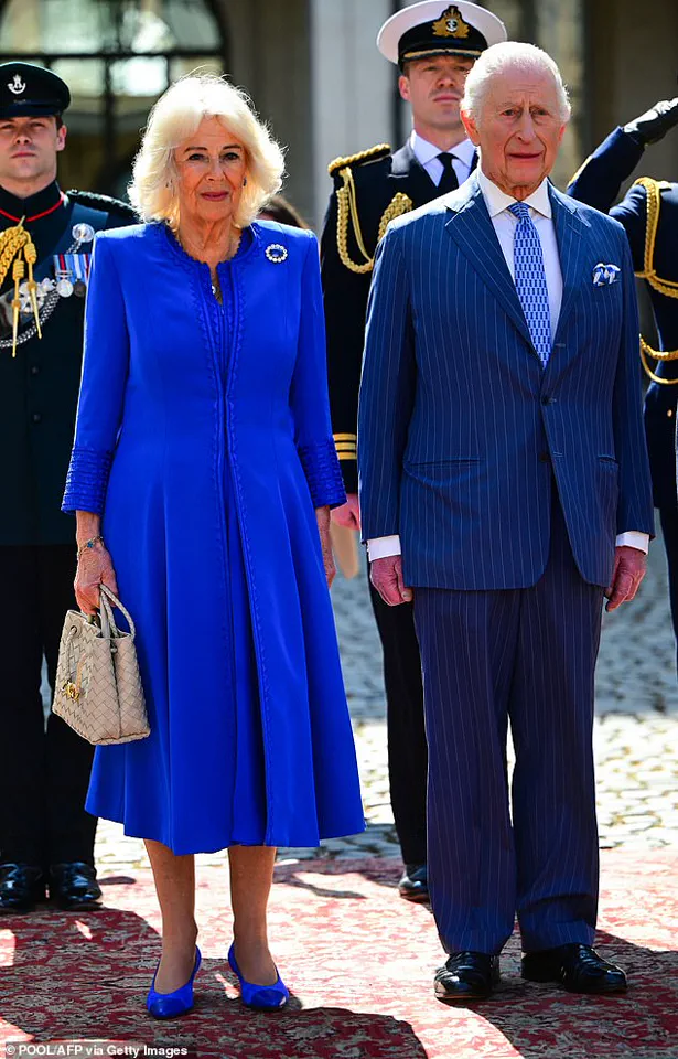 Queen Camilla, meanwhile, was spotted sporting a blue silk crepe dress and coat by Fiona Clare, along with an elegant diamond and sapphire brooch originally belonging to Queen Victoria during this visit.