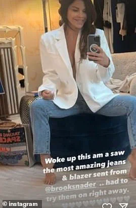 ‘Woke up this am and saw the most amazing jeans and blazer sent from @brooksnader… had to try them on right away,’ Sánchez wrote in white text on the photo, accompanied by a string of white heart emojis.