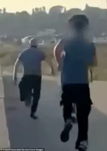 Jurors watched in stunned silence as the video revealed the teens’ relentless pursuit, with the boy in a red T-shirt falling over the victim before recovering to continue the chase.