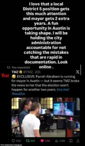 Initially, Abraham filed paperwork with the Austin Office of the City Clerk on January 14, listing her candidacy as ‘Mayor of Austin,’ a declaration that seemed to position her as a bold entrant into the city’s highest office.
