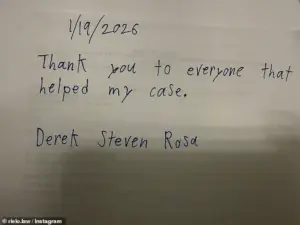 Signed with his full name, Derek Steven Rosa, the note read: ‘Thank you to everyone that helped my case.’ The document, which was shared by his defense attorney, Dayliset Rielo, has raised questions about the role of legal representation in such cases and the potential for rehabilitation within the justice system.