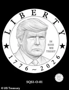 The proposed designs, which include close-ups of Trump’s face with ‘Liberty’ inscribed above and the years 1776 to 2026 below, have been narrowed down to three variations, each depicting the president looking in a different direction.